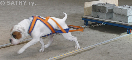 Vanhaenglanninbulldoggi Pölkky treenaa taakanvetoa
