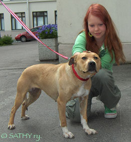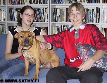 | A licenced Therapy Dog, American Pit Bull Terrier Sophi, meets her first young friends outside the Hospital for Children. | Sophi the Pit Bull seems to say to her handler "This girl needs some special attention, is it okay for me to give her a big hug?" | These cool guys are also patients and visiting days in hospital far away from homw. But after having a chat with Sophi the Pit Bull they know that everything will by just all right. |