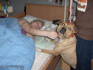 1. Hospitals and institutions are able to make a reservation for a SATHY therapy dog visit, free of charge. SATHY searches from it's records the best possible therapy dog and licensed therapy dog handler. After that the hospital and the licensed therapy dog handler makes an appointment that's okay for both sides. SATHY takes no fee for this acticity, it takes only care of the therapy dog and handler schooling.
