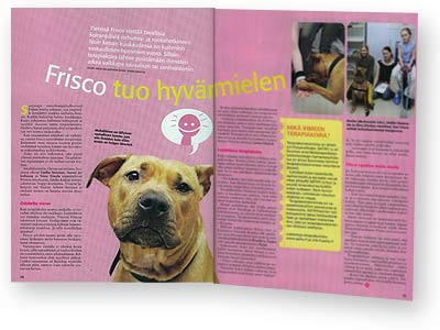 Yleensä Frisco viettää tavallisia koiranpäiviä riehumis- ja ruokahetkineen. Noin kerran kuukaudessa on kuitenkin vastuullisten hommien vuoro. Silloin terapiakoira lähtee piristämään ihmisten arkea vaikkapa sairaalaan tai vanhainkotiin.Saapuupa amerikanpitbullterrieri Frisco minne tahansa, sen ympärille kerääntyy joukko uteliaita ihmisiä. Kaikki haluavat halata haukkujaa. Koira suhtautuu hulinaan tottuneesti ja nuuhkii iloisena uutta ympäristöään. Heiluva häntä paljastaa, että terapiakoiran työ tuntuu mukavalta.